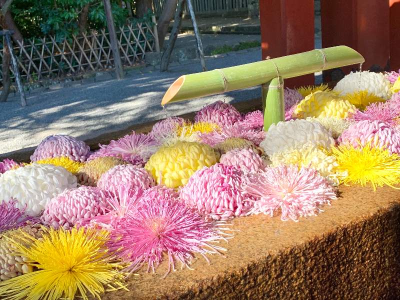 厳粛な空気の参道を歩くのも気持ちよく、さらに素敵だったのが美しい「花手水」。新型コロナ禍になってから閉鎖されている手水舎を利用して、不定期で行われているようです。木漏れ日に色鮮やかな菊が映えますね。