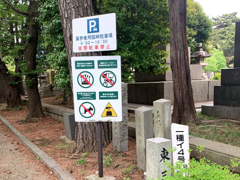 駐車場は管理事務所の向かいに墓参者専用駐車場(1時間以内)があるほか、園内にも墓参者専用臨時駐車場として、一部の通路沿いにも停められるようになっていました。両彼岸や花見の季節は通行規制されることもあります。