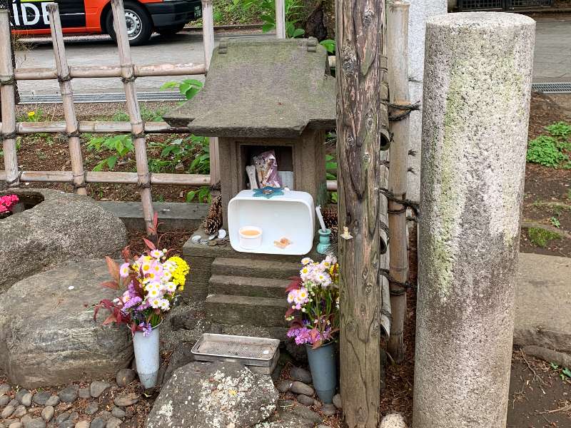 上野博士のお墓の区画内には石祠が建てられており、ドッグフードや犬のおやつなどがたくさん供えられていました。ハチ公像で待ち合わせする人はいても、お供えはできませんから、ここを訪れる人も多いのでしょう。渋谷からそう遠くない地で供養されているのは、両人(犬)にとっても、なんだか幸せそうに感じられました。