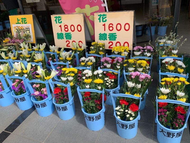 小平駅からの参道にある墓石店などで販売していて、一緒に手桶も貸してくれるサービスがあります。お彼岸時期のため、どのお店も豊富にありましたが、平時は事前に確認しておくといいですね。