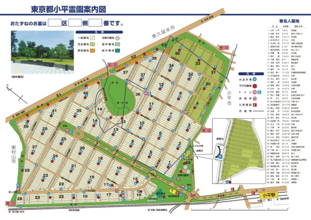 小平霊園には著名人も多く眠っています。案内地図にはここに眠る有名人の名前と、墓所の区画番号が48名分も掲載されていて、誰でも墓参可能なのです。