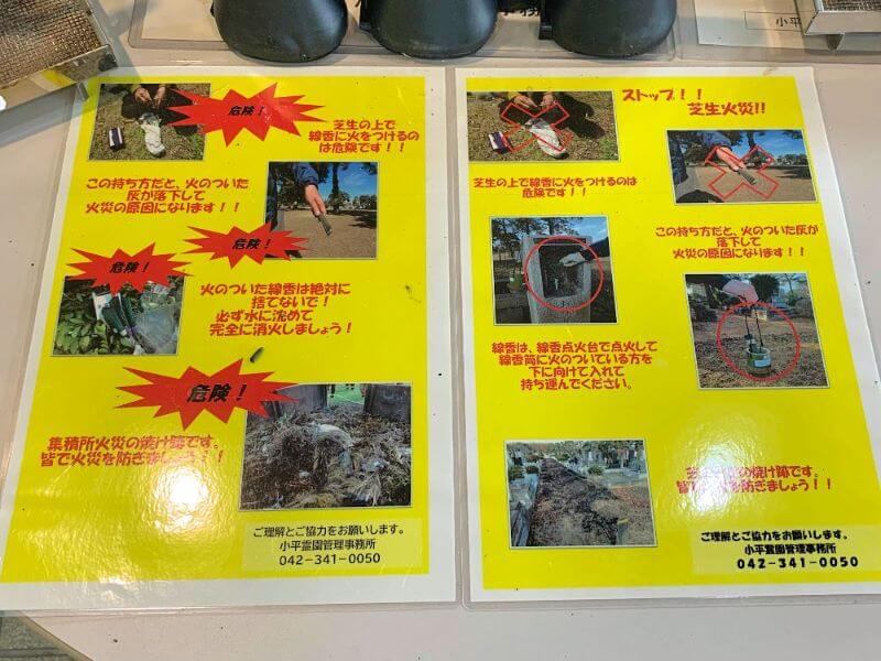 特に「火の元注意」を呼びかけ徹底しているようでした。芝生火災など予防のため、お線香は完全に消してから帰らなくてはいけません。