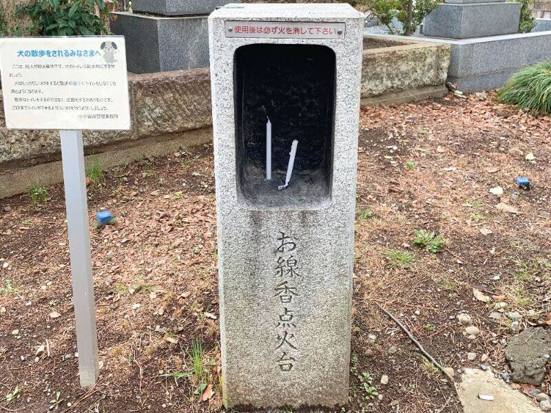 区画近くにはお線香点火台を発見。誰でも使える線香筒など、墓地でしか見ない道具のサービスが充実しています。