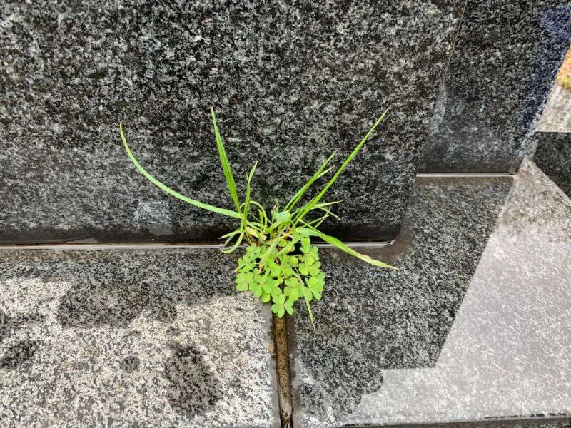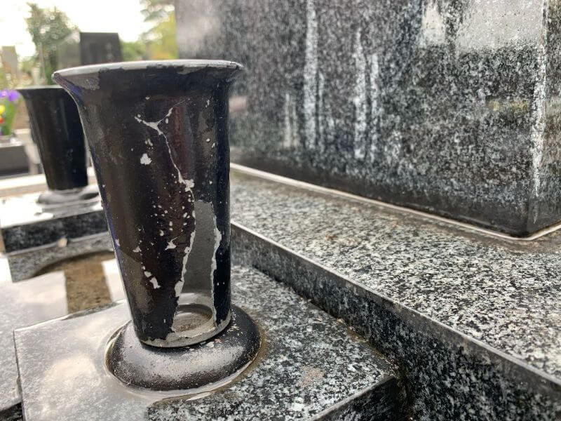 わりと直近でお掃除を頼んでいたとのことで、専用区画内はとてもきれいでした。が、供花用の花瓶を洗っていたら、パリンと割れてしまいました。また墓石の継ぎ目からは、雑草が。いずれも経年劣化によるものですね。