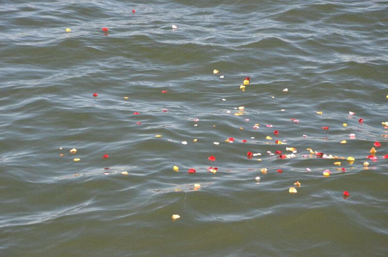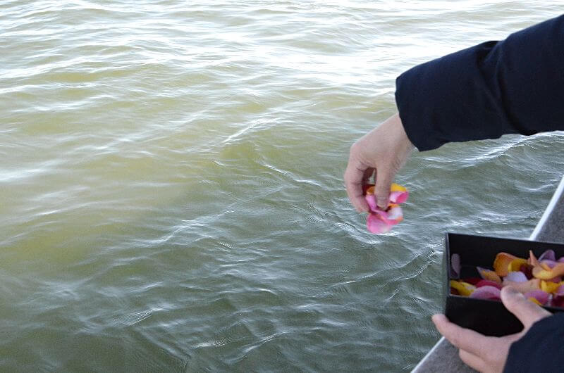 風も波も穏やかだったためしばらく近くを漂い続けた花びらたちも、天候によってはすぐに見えなくなってしまうこともあるそうです。故人にゆかりの飲み物や食べ物なども、ここで手向けることができます。