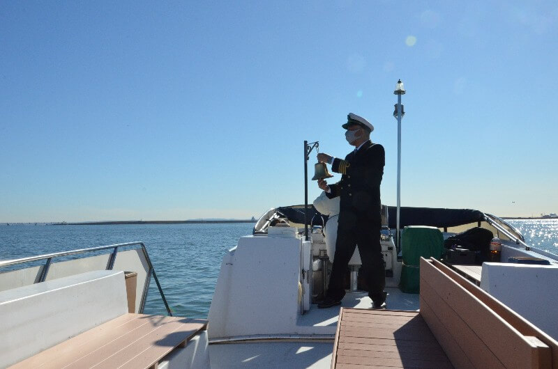 散骨が終わったら2階のスカイデッキでのセレモニーへ。船長がマリンベル(号鐘)を鳴らし、皆で黙祷をささげます。鐘の音が鳴り響き、神聖な空気に包まれました。