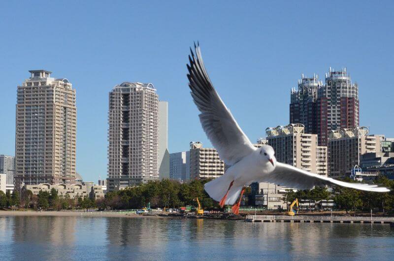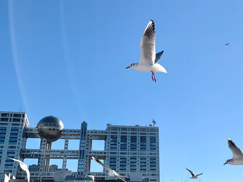 帰りの方が早く感じるのは、世の常なのでしょうか。あっという間にお台場まで戻ると、海鳥たちがやってきました。