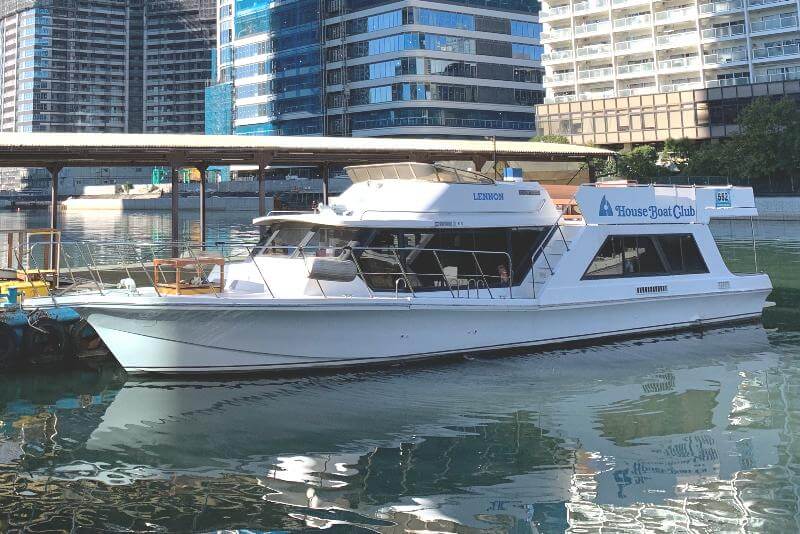 時刻は11時30分。本日乗せていただく「LENNON(レノン)号」がスタンバイしていました。開放的なスカイデッキが特徴の小型クルーザーです。