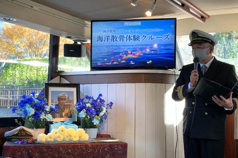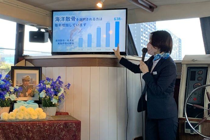海洋散骨の件数は右肩上がりに増えているそうで、本クルーズ主催のブルーオーシャンセレモニーさんでは、北海道から沖縄まで、昨年2020年には600件以上の散骨に立ち会われているとのこと。