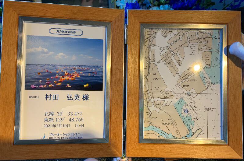 散骨ポイントの緯度と経度、日付と時刻、当日の写真が印刷され、額装されていています。