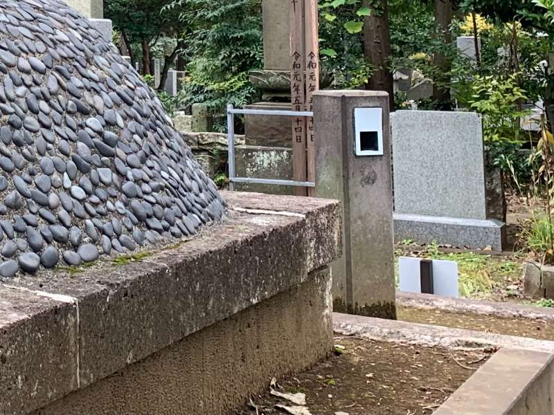 また、マップにも載る著名人のお墓にも名刺受けがあったことには驚きました。今回訪れたなかでは、東条英機、泉 鏡花のお墓にあった、ノーマルタイプの名刺受け。