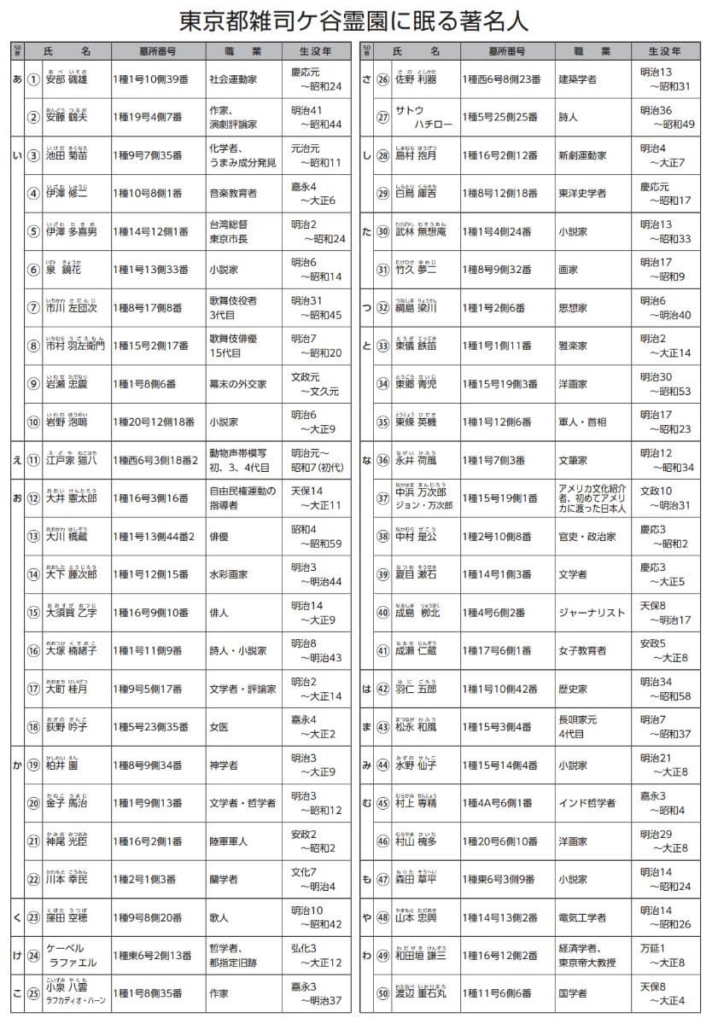 まずは管理事務所で、下の「東京都雑司ヶ谷霊園に眠る著名人」が掲載された園内マップを入手しないとはじまりません。