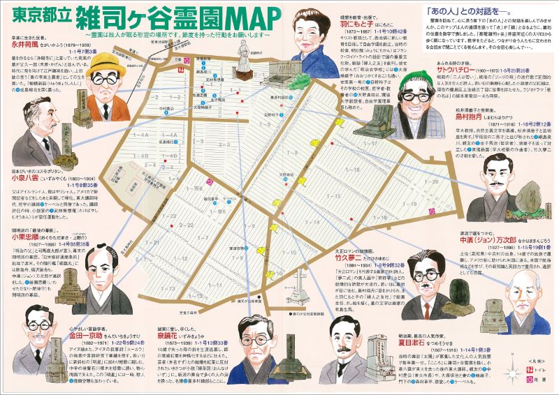 こちらの豊島区による雑司ヶ谷霊園MAPには、さらに抜粋された著名人の説明&イラスト付きです。